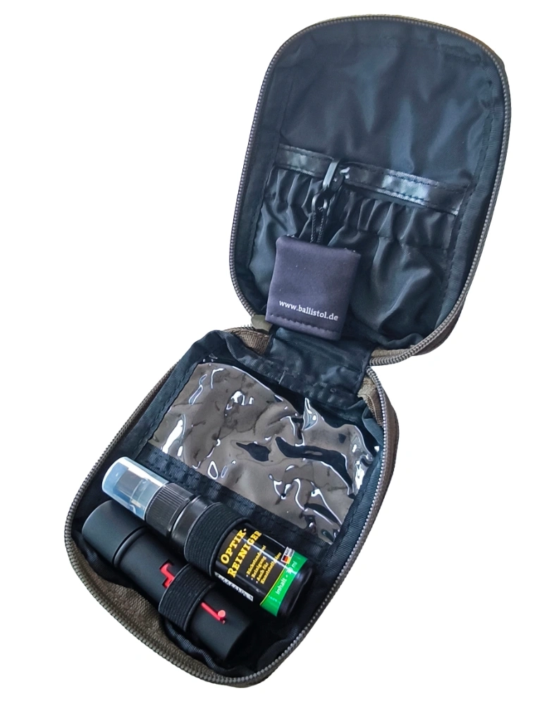 To keep your cleaning kit within reach at all times, it comes in a rugged olive-colored pouch built for outdoor use and designed to handle demanding conditions. Three compartments and two elastic loops keep the cleaner and brush securely in place, while the cloth can be stored flexibly inside or attached externally.