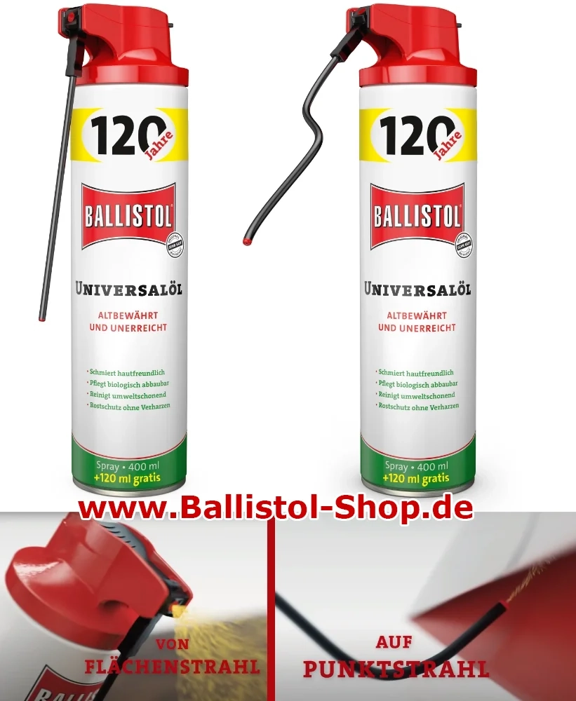Aus diesem Anlass gibt es zum Preis der 400 ml Standard Spraydose als Jubiläumsedition 520 ml mit dem hochwertigen Varioflex Doppelsprühkopf. Das bedeutet, 120 ml Ballistol und der Varioflex Sprühkopf sind solange der Vorrat reicht, als Zugabe gratis.